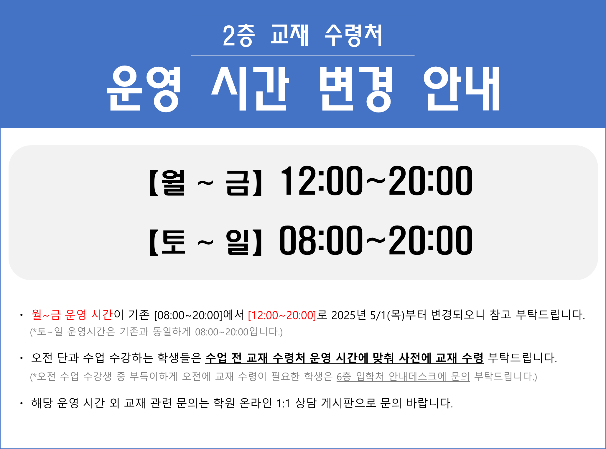 2025³â 5¿ù 1ÀÏ ¸ñ¿äÀϺÎÅÍ 2Ãþ ±³Àç ¼ö·Éó ¿î¿µ½Ã°£ÀÌ ¾Æ·¡¿Í °°ÀÌ º¯°æµË´Ï´Ù.